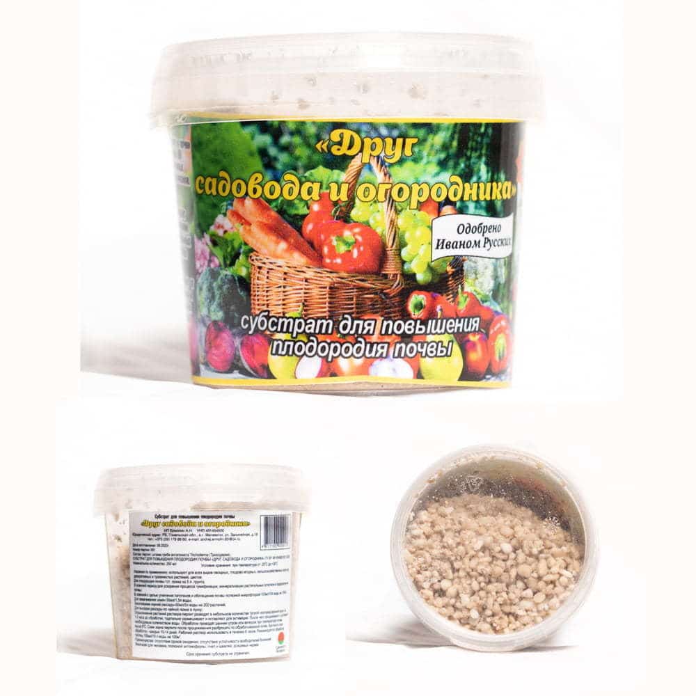 Субстрат для повышения плодородия почв «Друг садовода и огородника» представляет собой гранулы агроперлита, заселенные мицелием изолятов грибов рода Триходерма с высокой антибиотической и гиперпаразитической активностью в отношении фитопатогенов, в том числе вызывающих гнили овощей при хранении (Fusarium, Alternaria, Phoma, Ascochyta, Verticillium, Sclerotinia, Botrytis, Septoria и другие). При определенных условиях мицелий триходермы может переходить в фазу спороношения. В этом случае гранулы покрываются зеленым налетом спор. Иначе гранулы остаются белыми или кремовыми. При любом варианте препарат является активным и может использоваться по назначению. Препарат может иметь нейтральный или более специфический запах, так как представляет собой живой мицелий и споры грибов. Также субстрат высокоэффективен для борьбы с грибными инфекциями в процессе длительного хранения овощей.